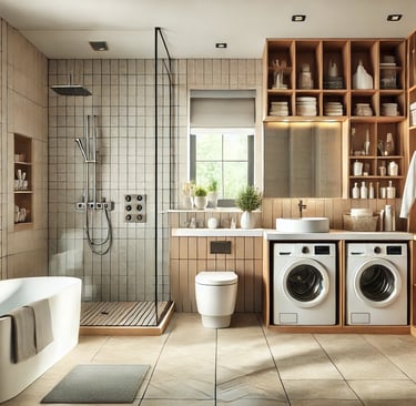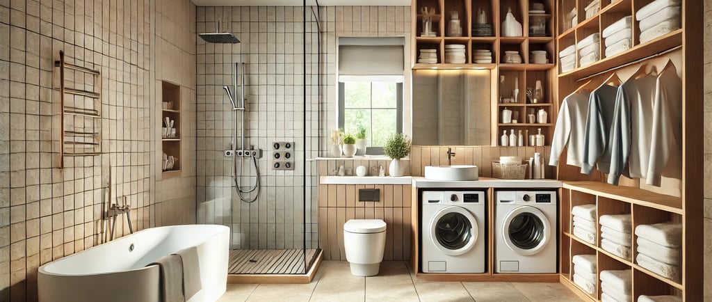 Si votre espace le permet, intégrer un coin buanderie dans votre salle de bain peut être un véritable gain de temps. En fonction de vos besoins, un placard de 80 cm de profondeur et 120 cm de large peut accueillir une machine à laver, un sèche-linge et des espaces de rangement. Veillez cependant à bien séparer l’espace buanderie de la zone de toilette pour des raisons d'hygiène et de confort.